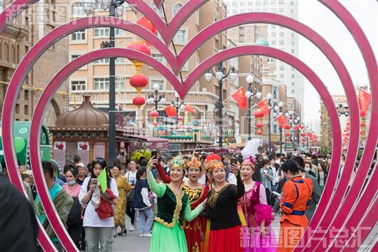 2023年4月30日,游客在新疆国际大巴扎景区自拍。