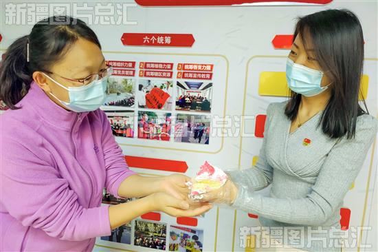 2022年10月1日,乌鲁木齐市水磨沟区七纺街道田园社区干部为居民送蛋糕。