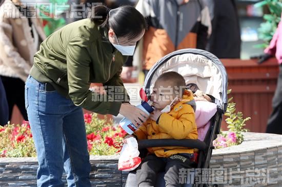 2022年10月2日,乌鲁木齐市天山区日月天山星光小镇,市民正在给孩子喂水。