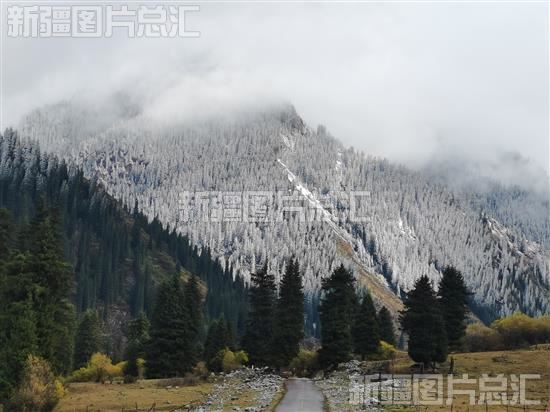 2022年10月1日,昭苏县大草原上的夏塔峡谷大雪纷飞,降下今年第一场秋雪。正午天气放晴后,山坡上披上厚厚的积雪,挺拔是雪松披上了银装,天地间一片苍茫,在辽阔的草原和皑皑白雪的陪衬下,形成独一无二的美景,成为当地秋季特有的风景。