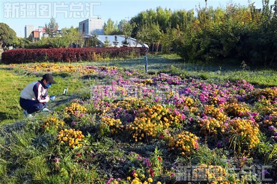 2022年10月2日,一位女士在乌鲁木齐市水磨沟区南湖市民广场外拍摄鲜花。