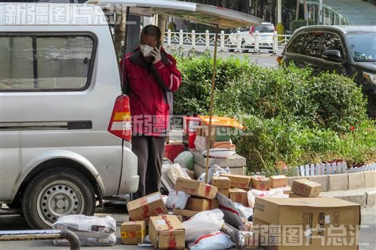2022年10月4日,乌鲁木齐市天山区光明路,快递小哥正在派送快递。