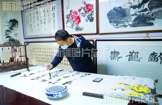 2022年10月4日,在乌鲁木齐市水磨沟区艺林书画社,谈坚立老师正在创作有关重阳节内容的书法作品。
