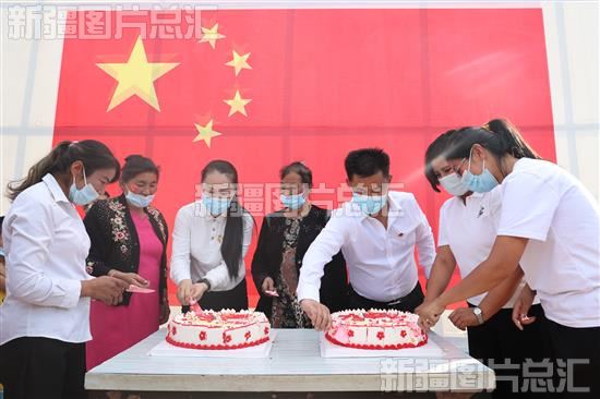 2020年10月1日,干部代表和村民代表为参加互动的各族干部群众分发蛋糕。