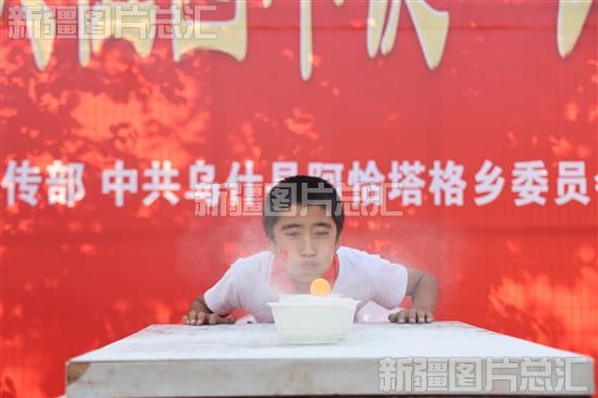 2022年10月1日,乌什县阿恰塔格乡托克逊铁提尔村学生在进行吹乒乓球比赛。