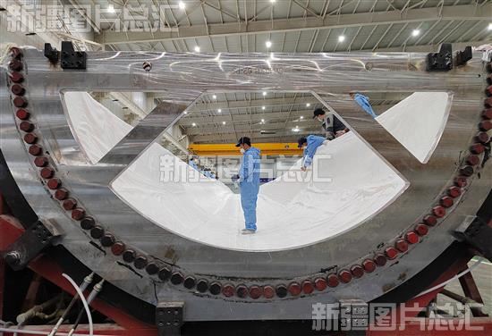 2023年5月8日,东方电气(新疆)新能源高端装备制造基地工作人员在进行风电叶片的铺层工序。该基地具备批量生产风电机组和叶片能力,2022年9月投产,截至目前已生产叶片166支、主机96台,今年排产量预计300套风力发电机组。