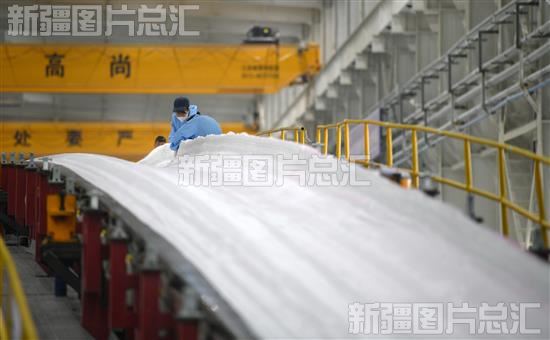 2023年5月8日,东方电气(新疆)新能源高端装备制造基地工作人员在进行风电叶片的铺层工序。该基地具备批量生产风电机组和叶片能力,2022年9月投产,截至目前已生产叶片166支、主机96台,今年排产量预计300套风力发电机组。