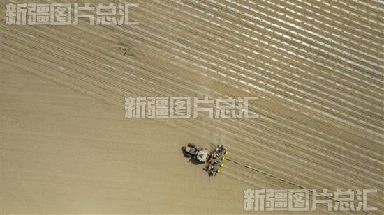 2023年5月13日,新疆生产建设兵团第十师183团职工驾驶鲜食玉米播种机在田间进行播种作业(无人机拍摄)。