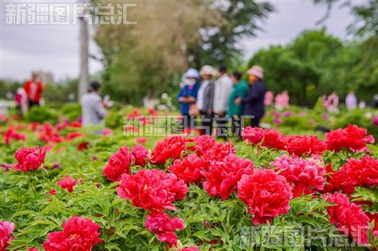 近日,昌吉市滨湖河景区牡丹园里的各色牡丹花、芍药花、马莲花竞相绽放,姹紫嫣红、花香四溢,吸引了众多游客前来观赏游玩。