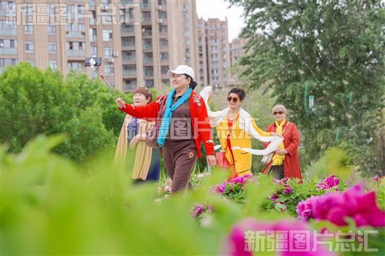 近日,昌吉市滨湖河景区牡丹园里的各色牡丹花、芍药花、马莲花竞相绽放,姹紫嫣红、花香四溢,吸引了众多游客前来观赏游玩。