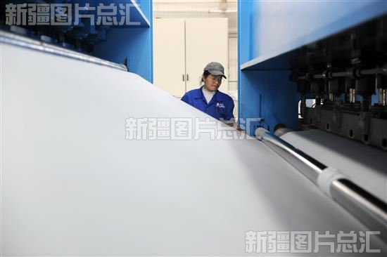 2023年5月16日,新疆磐基科技股份有限公司石墨烯土工合成新材料的基础材料生产线上,工人在查看产品质量。