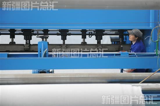 2023年5月16日,新疆磐基科技股份有限公司石墨烯土工合成新材料的基础材料生产线上,工人在查看机器运行情况。