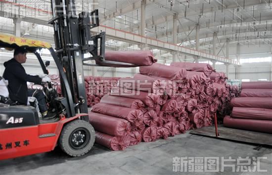 2023年5月16日,在新疆磐基科技股份有限公司,工人驾驶叉车搬运基础材料。