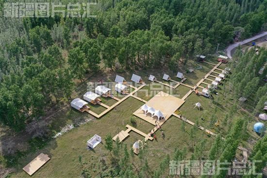 2023年5月13日,俯瞰位于博乐市青得里镇阿里翁白新村的阿利翁轻奢露营地(无人机拍摄)。