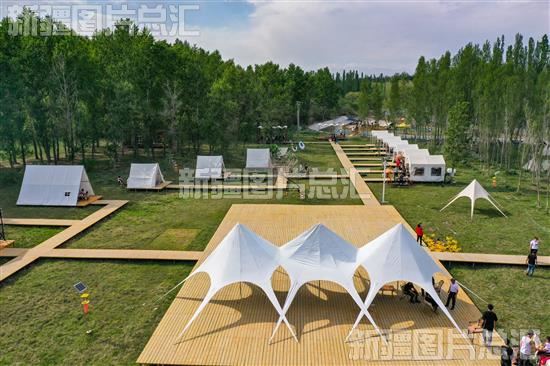 2023年5月13日,俯瞰位于博乐市青得里镇阿里翁白新村的阿利翁轻奢露营地(无人机拍摄)。