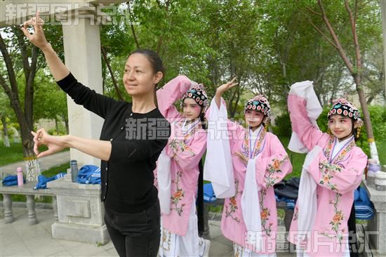 2023年5月16日,乌鲁木齐市第21小学老师为即将表演的小演员教授舞蹈动作。