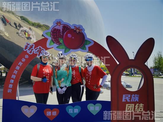 2023年5月10日,克拉玛依市第42个民族团结进步教育月活动启动仪式现场,市民在克拉玛依一号井景区民族团结景观前留影。