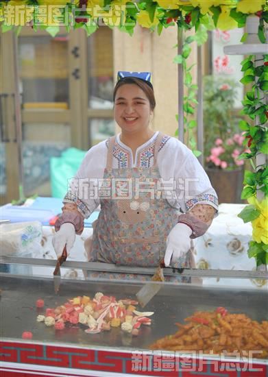 2023年5月9日,商家在位于昌吉国家农业高新技术产业示范区的天山北麓葡萄酒风情街制作美食。该风情街是全疆第一个以葡萄酒为主题的文创旅游街区,目前已有中信国安、大唐西域等十余家知名酒企入驻。