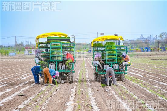 2023年5月20日,在新疆昌吉回族自治州呼图壁县五工台镇十九户村,农民利用番茄移栽机移栽番茄苗。
