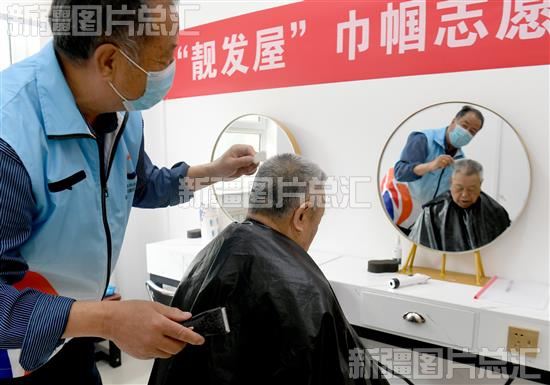2023年5月19日,便民服务队队员为社区居民理发。