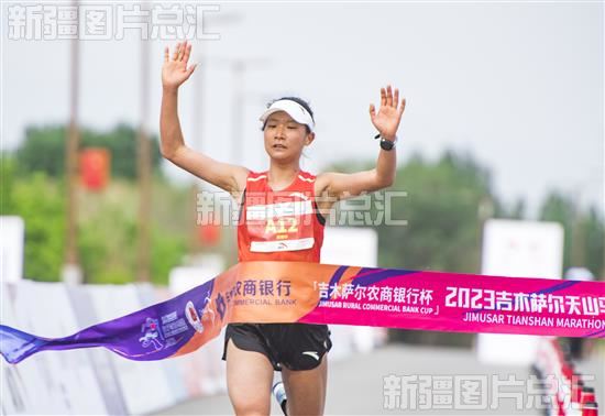 2023年5月21日,2023吉木萨尔天山马拉松比赛,全程马拉松女子组第一名冲过终点。