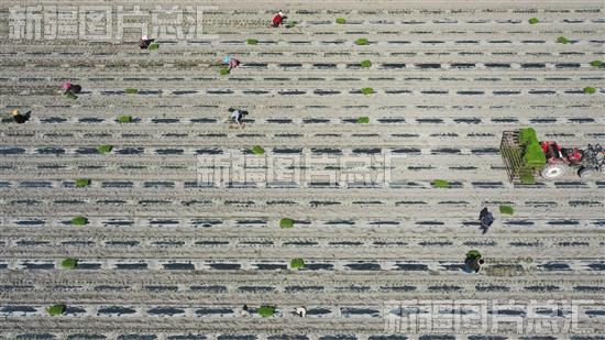 2023年5月10日,工人在博湖县乌兰再森乡博湖花海移栽花苗(无人机拍摄)。