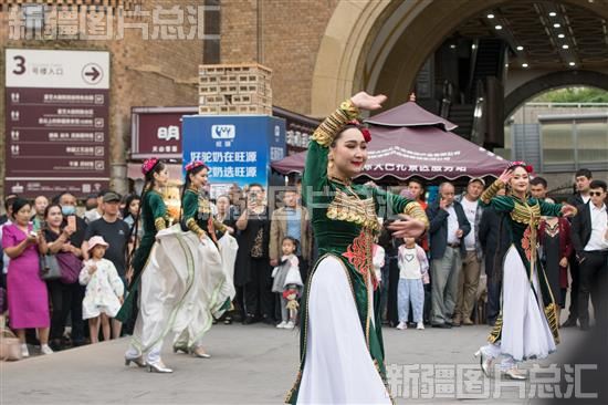 2023年5月21日,新疆国际大巴扎景区,游客跳起了欢快的舞蹈。