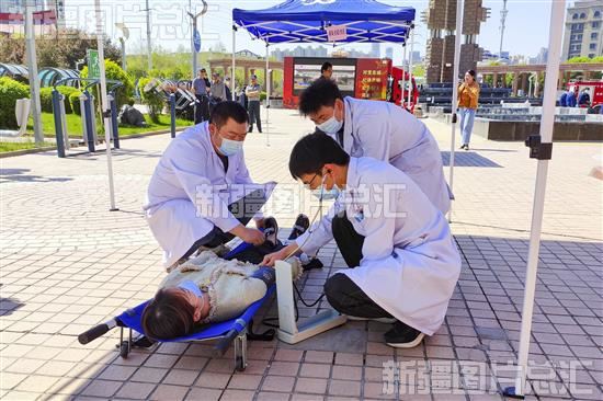 2023年5月11日,在乌鲁木齐经济技术开发区(头屯河区)新能大厦前的卫星广场上举办的防灾减灾应急宣传活动及演习现场,医护人员演示查看伤者伤势。