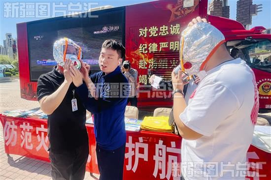 2023年5月11日,在乌鲁木齐经济技术开发区(头屯河区)新能大厦前的卫星广场上举办的防灾减灾应急宣传活动及演习现场,乌鲁木齐经济技术开发区消防救援大队消防干事对救援绳、防烟面罩、灭火毯等应急逃生装备使用进行讲解培训。