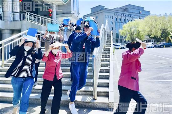 2023年5月11日,在乌鲁木齐经济技术开发区(头屯河区)新能大厦前的卫星广场上举办的防灾减灾应急宣传活动及演习现场,大厦内工作人员有序、快速地从大厦内跑到广场的开阔地。