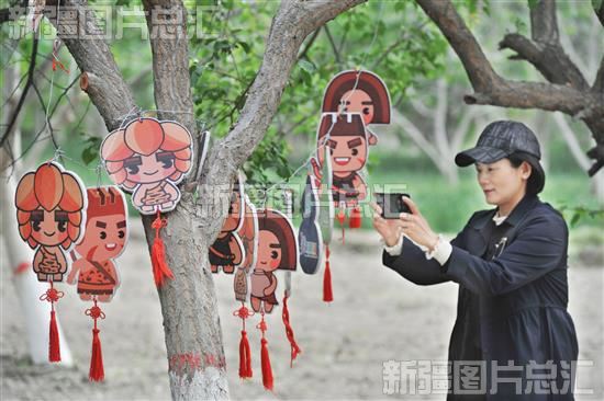 2023年5月9日,游客在阿图什市阿湖乡托万买里村林间拍照。