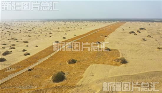 2023年5月8日拍摄的尉犁县墩阔坦乡托布协防沙治沙现场(无人机拍摄)。