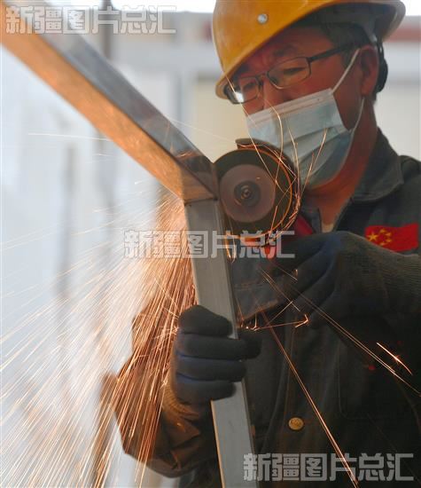 2023年5月22日,工作人员在乌鲁木齐高新区(新市区)北区工业园的新疆鑫明鼎盛智能装备科技有限公司,对集装箱售卖亭门框进行打磨作业。
