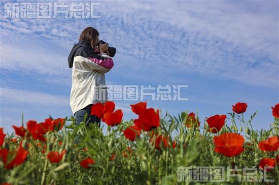2023年5月16日,游客在新源县塔勒德镇南山山坡拍摄天山红花。
