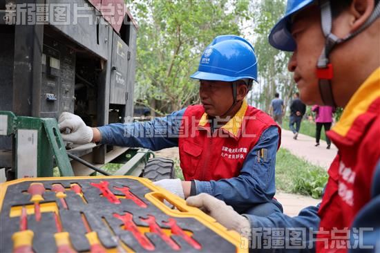 2023年5月19日,在乌什县依麻木镇托万克麦盖提村生态园,乌什县供电公司在保障供电。