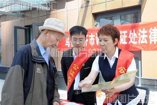 2023年5月20日,乌鲁木齐市诚信公证处的工作人员在为轩和苑小区的居民讲解房屋公证的方法。
