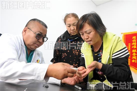2023年5月20日,苏来曼医生诊所,医生帮助轩和苑小区的居民测量血糖。