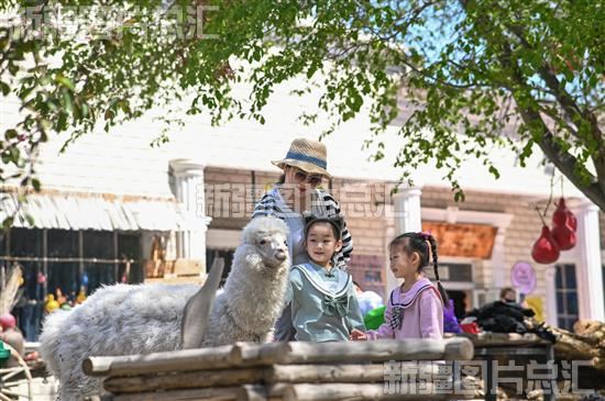 2023年4月28日,游客在呼图壁县五工台镇幸福村观赏羊驼。