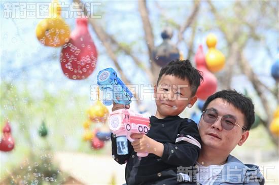 2023年4月28日,游客在呼图壁县五工台镇幸福村游玩。