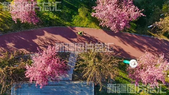 2023年4月27日,游客在呼图壁县海棠路游览赏花(无人机拍摄)。