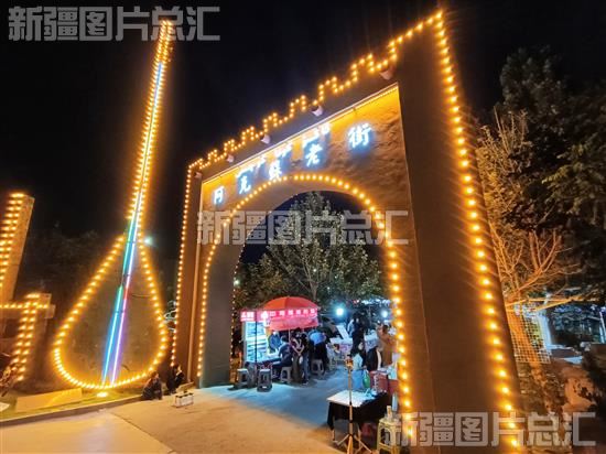 2023年5月22日,阿克苏市依干其乡老街夜市入口夜景。