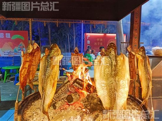 2023年5月22日,阿克苏市依干其乡老街夜市上的烤鱼。