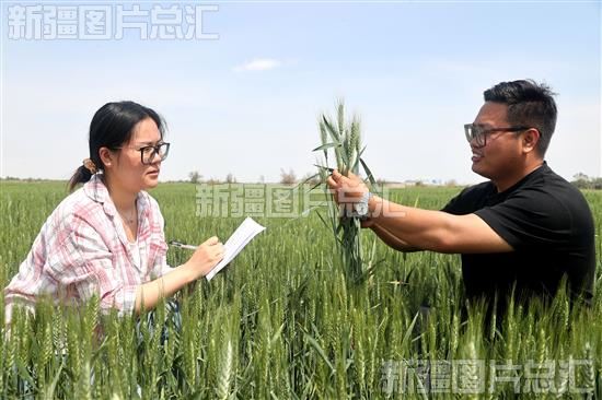 2023年5月25日,六师五家渠市101团青湖镇三连“两委”和种植户一起查看冬小麦长势情况。