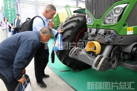 2023年5月25日,观众在2023新疆农业机械博览会上参观拖拉机。