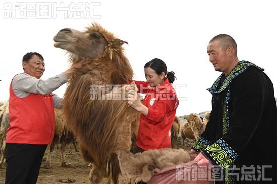 2023年5月19日,和布克赛尔蒙古自治县牧场,工作队队员帮助牧民给骆驼剪羊毛。