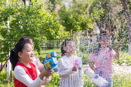 2023年5月27日,孩子们在玩吹泡泡游戏。