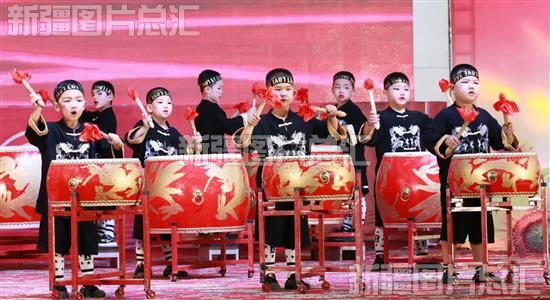 2023年5月27日,新疆生产建设兵团第三师四十一团草湖镇幼儿园的孩子们在表演节目《鼓韵中华》。