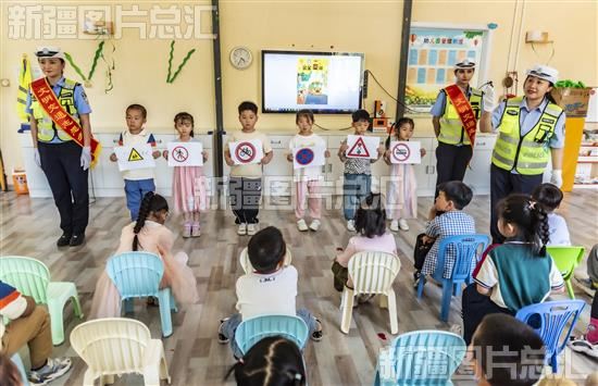 当天,克拉玛依市克拉玛依区公安分局交警大队交警来到当地幼儿园开展“交通安全六一行”活动,为小朋友讲解交通安全知识,认识交通标志。