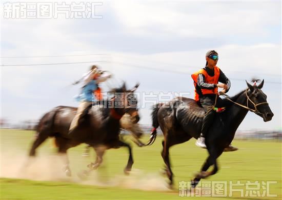 2023年5月27日,骑手在阿勒泰市汗德尕特乡赛马场竞技。