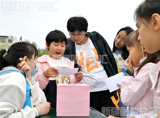 2023年5月28日,乌鲁木齐高新区(新市区)北京路街道辖区小朋友在北京路街道未成年人保护工作站揭牌仪式参加互动游戏。